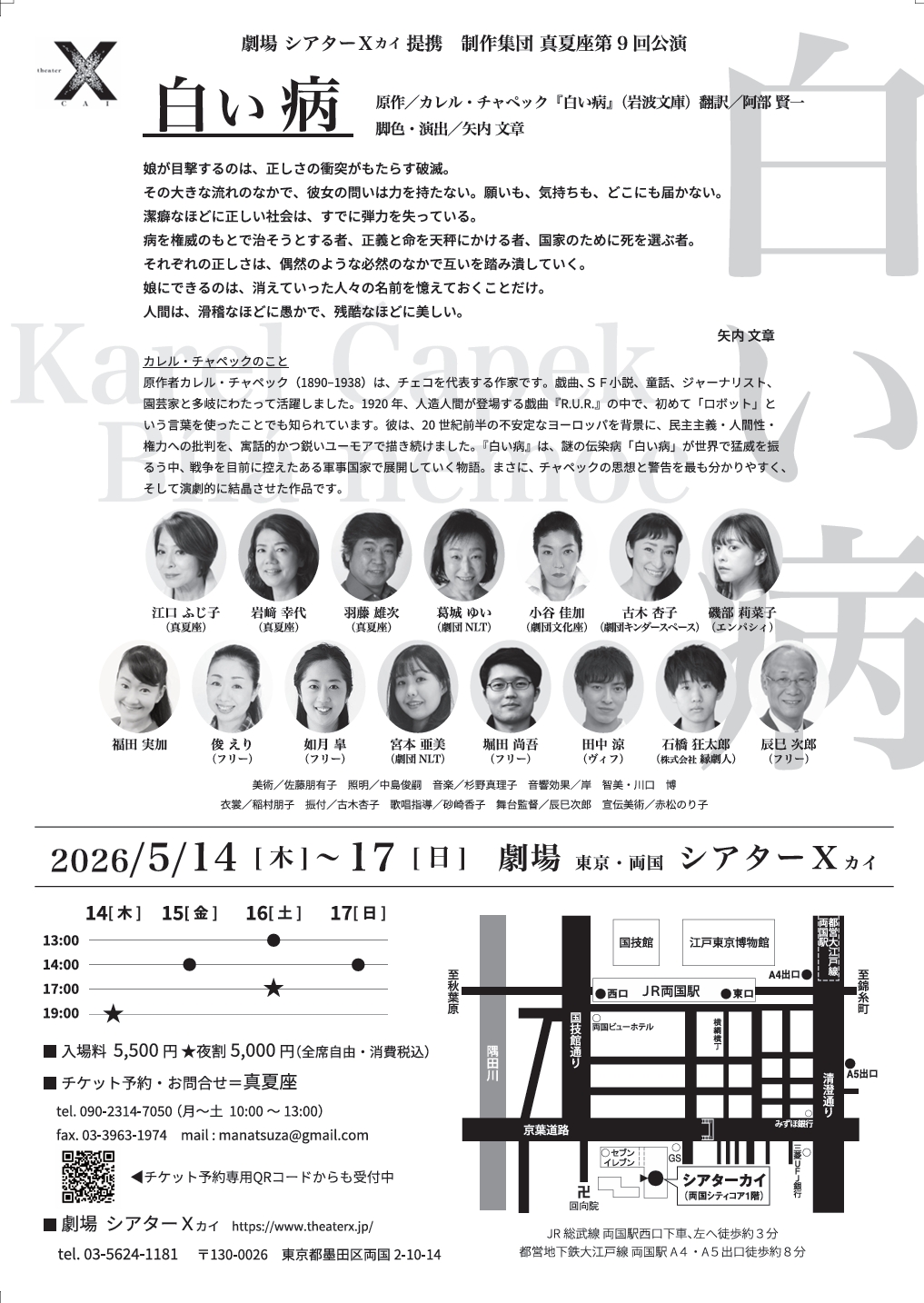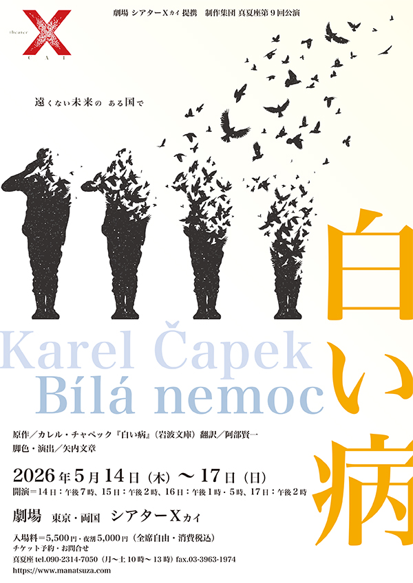 劇場シアターX提携 制作集団・真夏座第9回公演 『白い病』 作/カレル・チャペック 「白い病」(岩波文庫) 翻訳/阿部賢一 脚色・演出/矢内文章 5月14日(木)~17日(日) 劇場 東京・両国 シアターX 予約・お問合 […]